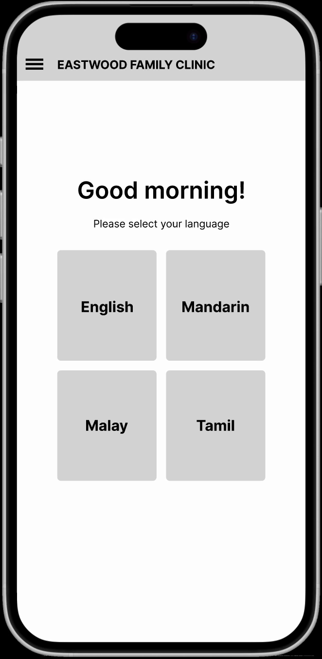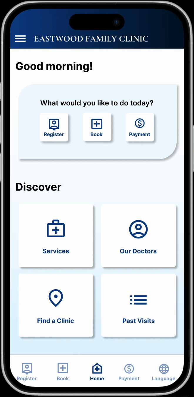 Eastwood is a healthcare companion app designed for a family clinic setting. It allows patients and caregivers to register, pre-fill health surveys, book appointments, and track their live queue status—reducing wait-time anxiety and streamlining in-clinic operations. The goal was to create a calm, accessible experience that prioritises clarity and trust in a medical setting.